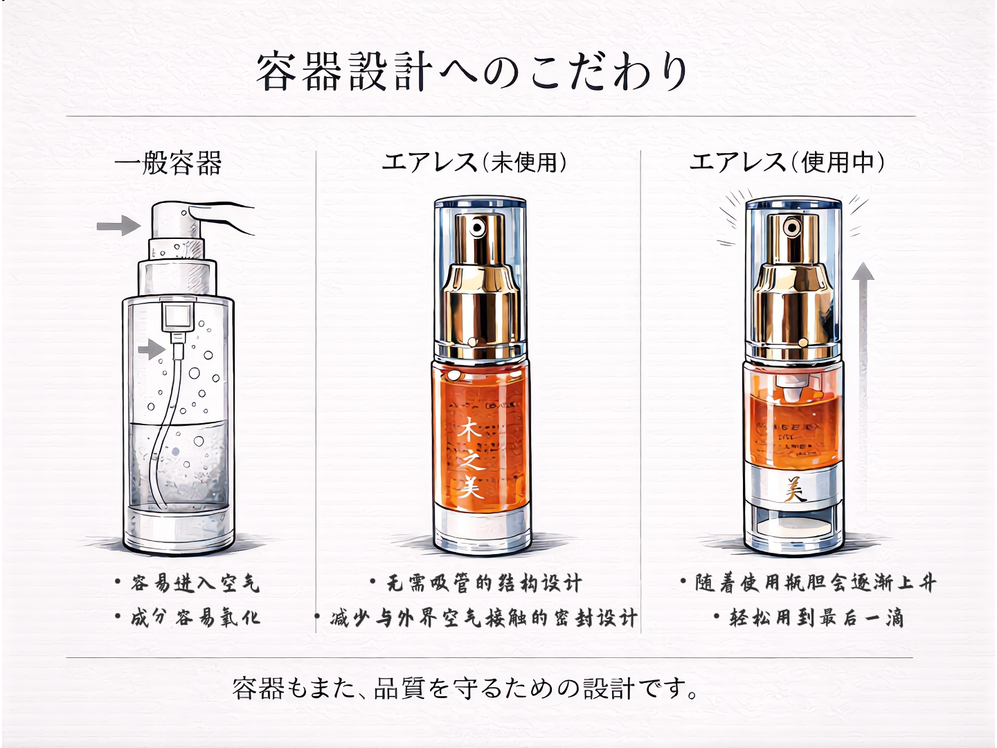 特别采用真空按压容器,有效降低内容物的氧化风险,并确保从第一滴到最后一滴都能稳定保持有效成分。